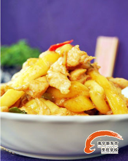 芒果,又称檬果、闷果、蜜望、望果、庵波罗果等,是营养丰富的热带水果。其果肉细腻,含有糖、蛋白质、粗纤维,芒果所含有的维生素A成分特别高,是所有水果中少见的。其次维生素C含量也不低,风味独特,深爱人们喜爱。常食芒果,具有抗癌、美化肌肤、防治高血压、动脉硬化等功效。此菜系将有“热带果王”美誉的芒果,去皮取肉切成条,再与鸡肉条合烹而成。成菜后,鸡肉鲜嫩洁白,芒果微酸带甜,色彩鲜艳,老少皆宜。