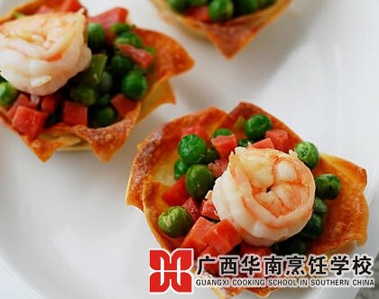 9、加入虾仁翻炒几下出锅,放入馄饨皮烤的盏里。