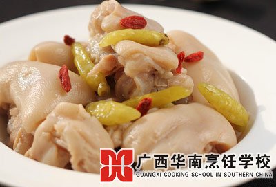 原料:猪手、泡椒、姜片、红辣椒、八角、桂皮、香叶、花椒、小茴香、糖、白醋、白酒、盐
