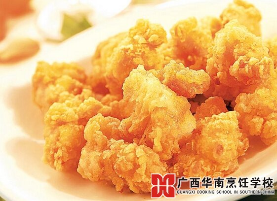 主料:鸡肉丁500g、面包糠100g、盐适量、酱油适量、淀粉适量、胡椒粉适量、孜然粉适量