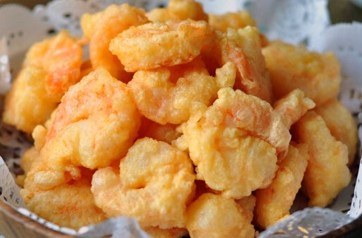 4、热油,放入蘸匀软炸糊的虾仁,炸制到均匀上色,漂浮起来即可捞出;
