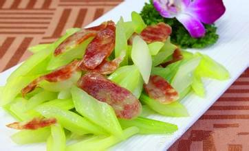 4、将西芹入锅,大火翻炒至断青,倒入腊肠,炒匀。