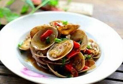 4、锅热油,入辣椒与蒜爆香,入花蛤,微微翻炒。