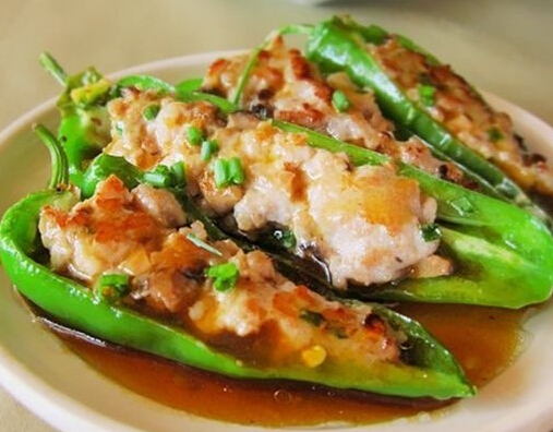 6、把搅拌好的肉酿制尖椒,小火慢煎至金黄起锅,最后撒上葱花即可。