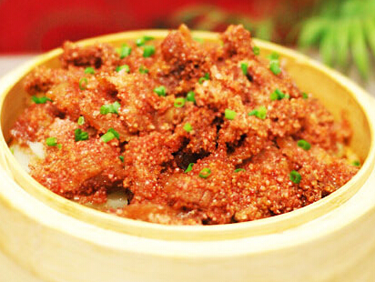7、将粉蒸肉放入蒸锅中,大火蒸约1小时,取出撒上葱花,即可。