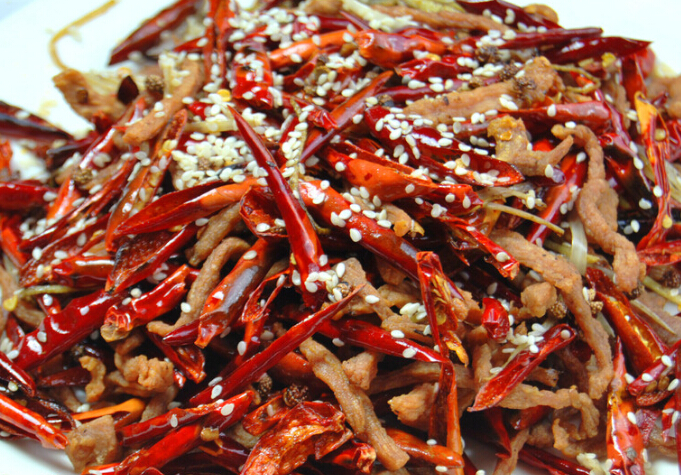4、锅底留少许油,下入葱段、红椒和花椒煸出香味,最后把炸过的肉丝下入锅内;