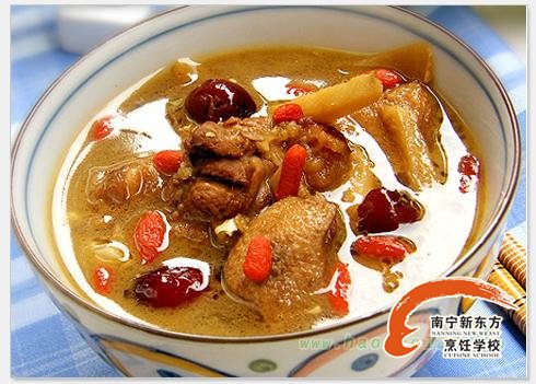 烹制:各物分别洗净。牛大力、核桃、花生、陈皮稍浸泡;红枣去核;猪脚筋热水浸泡,“汆水”,再洗净;鸡脚去甲,敲裂。一起下瓦煲,加清水2500毫升(约10碗量),武火滚沸后改文火煲约2小时,下盐便可。为4~5人用。南宁新东方烹饪:www.gxxdfpr.com