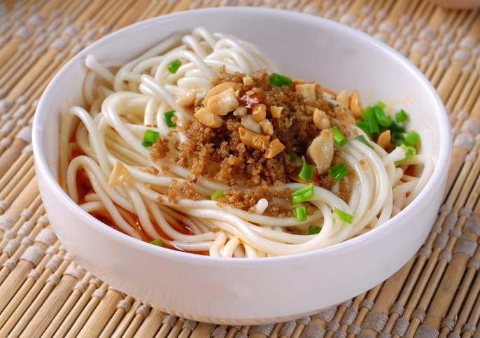 5、在面上放置肉酱,撒上葱花,放上青菜,放置花生碎,肉酱上放置香菜即可。