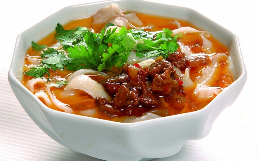 9、一手持削面刀,一手托面团,用刀沿面团的外侧向里一刀挨一刀将其削入沸水锅中,煮3分钟左右即可出锅。