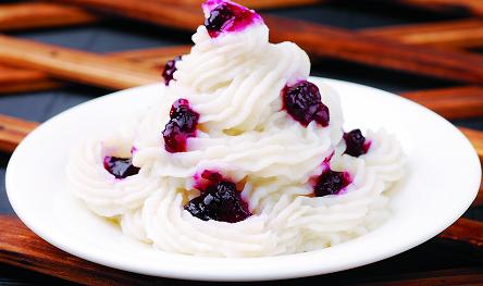 3、在山药泥加入蓝莓果酱和蓝莓果粒搅拌均匀。