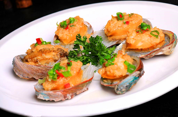 5、将鲍鱼摆入盘中,再上面放入调好的蒜蓉汁,水开后上锅蒸5分钟后取出,在上面撒上红椒碎和葱花,淋入热油即可。