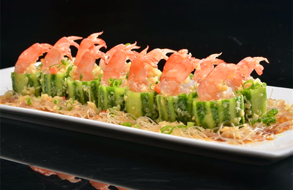4、将拌好的虾肉填入丝瓜盅,将之前预留的虾尾插在中央,然后装盘放入蒸锅中,上气后大火蒸8分钟左右。