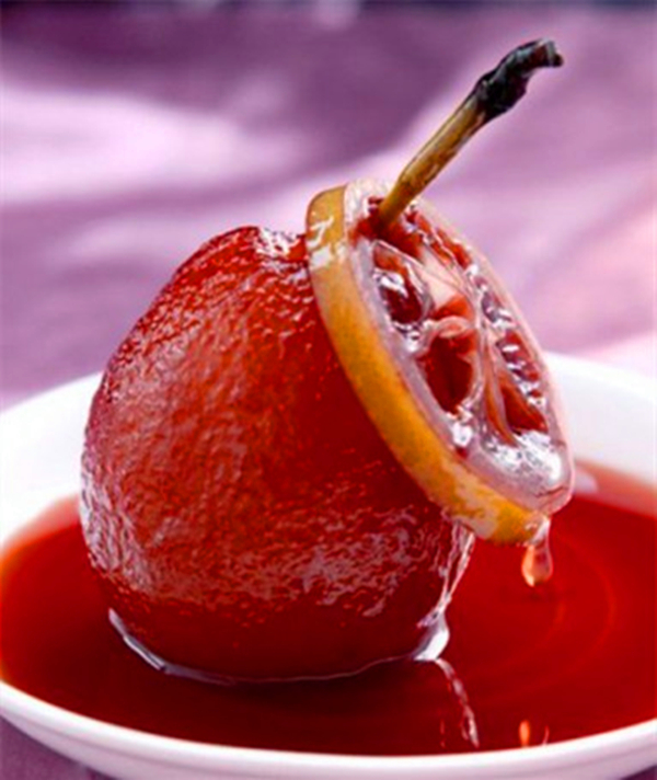 3、放入水晶梨,中火煮至红酒翻滚,小火继续煮一个小时后关火。