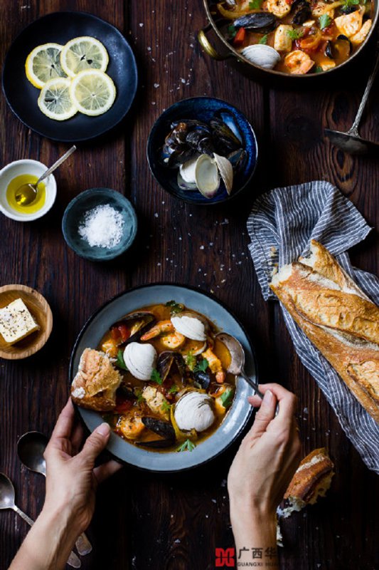 食材:蛤蜊、青口、鱼、虾、藏红花、百里香、洋葱、茴香、蒜、番茄、海鲜汤底、蔬菜汤底、白葡萄酒、月桂叶、盐、柠檬