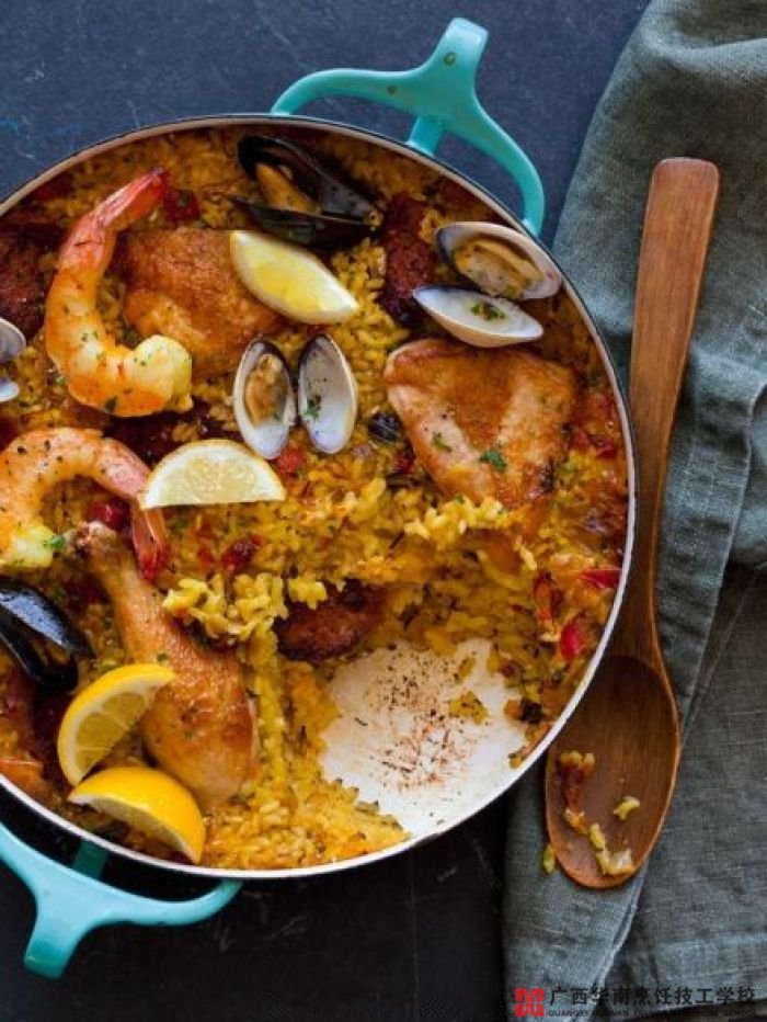 材料:鱿鱼,虾,花蛤,大米,洋葱,胡萝卜,红甜椒,豌豆,西红柿,柠檬,蒜,盐,白葡萄酒,咖喱粉,迷迭香。