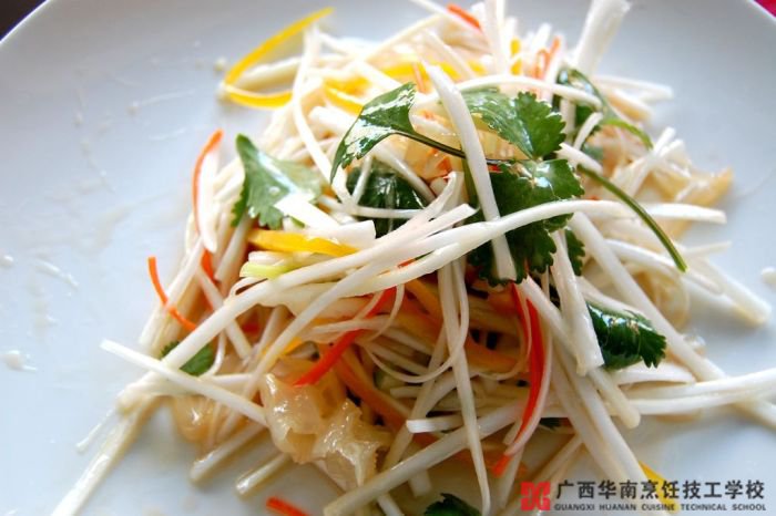 3、取一只大一点的盆,将各色丝任性地扔进去,讲调好的酱汁倒入拌匀