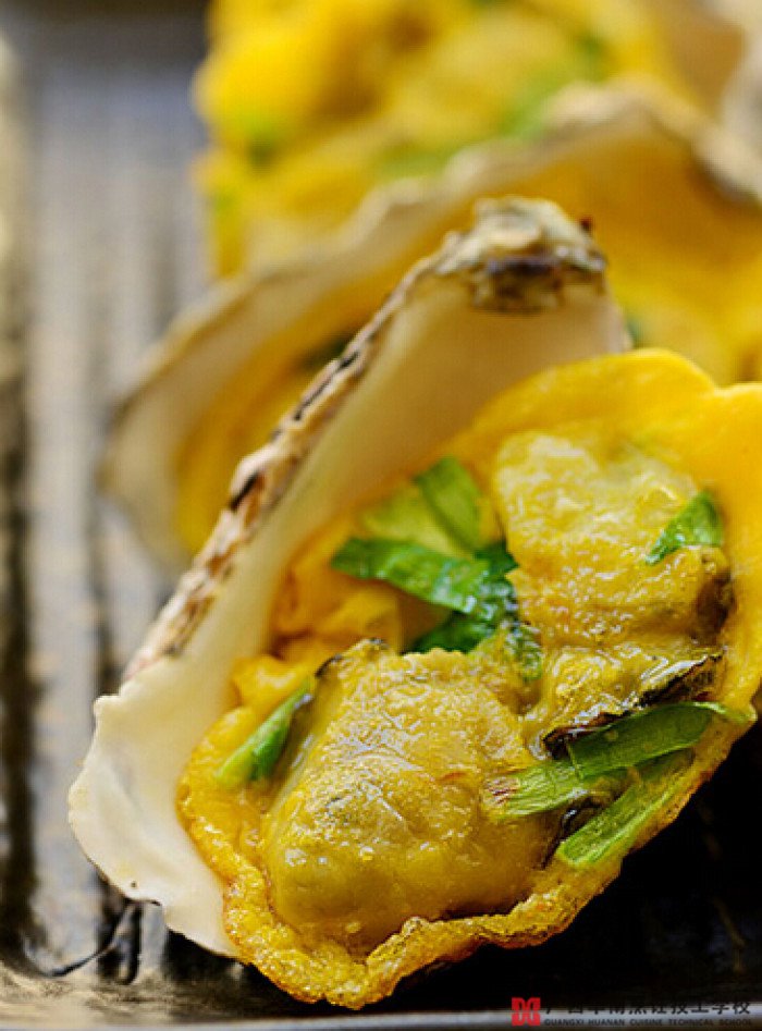 4、放入韭菜段,将蚝肉裹上淀粉,投入蛋液中,锅子烧热,倒入橄榄油,用勺捞出蚝肉同时盛着蛋液放到平底锅中煎制,煎至两面金黄盛出即可。