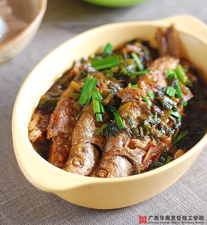 食材:餐条鱼、雪菜、淀粉、姜蒜、料酒、生抽、老抽、糖