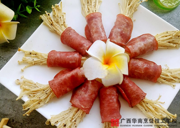 主料:培根味火腿10片、金针菇一把。