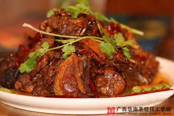 6、放入海鲜酱油、老抽、蚝油、香叶、冰糖,上色后放入500ml啤酒。大火烧开后,小火炖30分钟。大火收汁,放入盐、青椒、葱丝。
