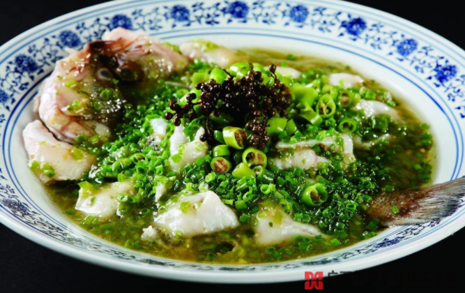 (3)走菜流程:取草鱼1条装人盘中。青菜椒碎150克飞水,加盐5克、味精3克、鸡精3克、花椒油4克、蒜末、姜末各5克、辣鲜露5克、蒸鱼豉油10克拌匀,覆盖在鱼身即可走菜。
