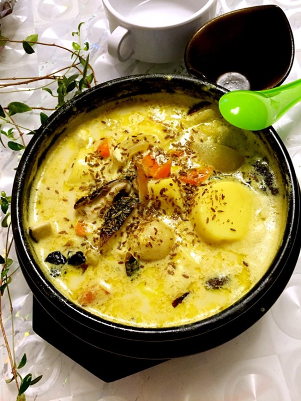 5、将炒锅中的咖喱汤汁倒入石锅,大火烧开。