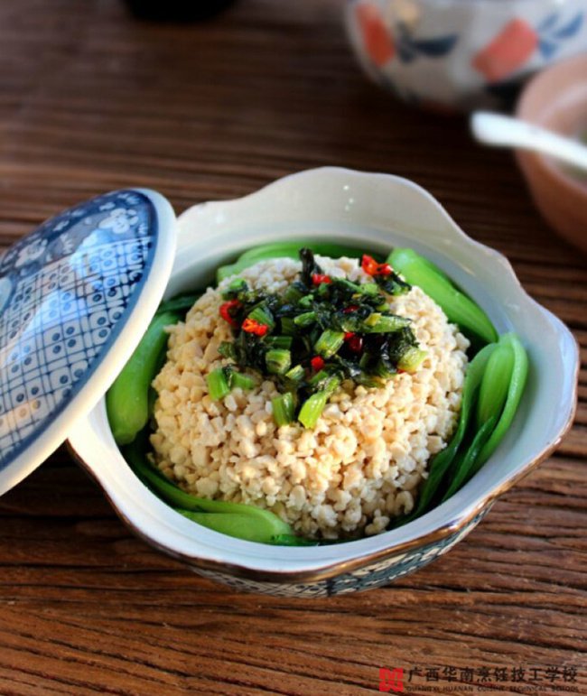 食材:北豆腐300克、蛋清2~3个、雪里红适量、红辣椒1个、鸡精1~2茶匙、盐1~2茶匙