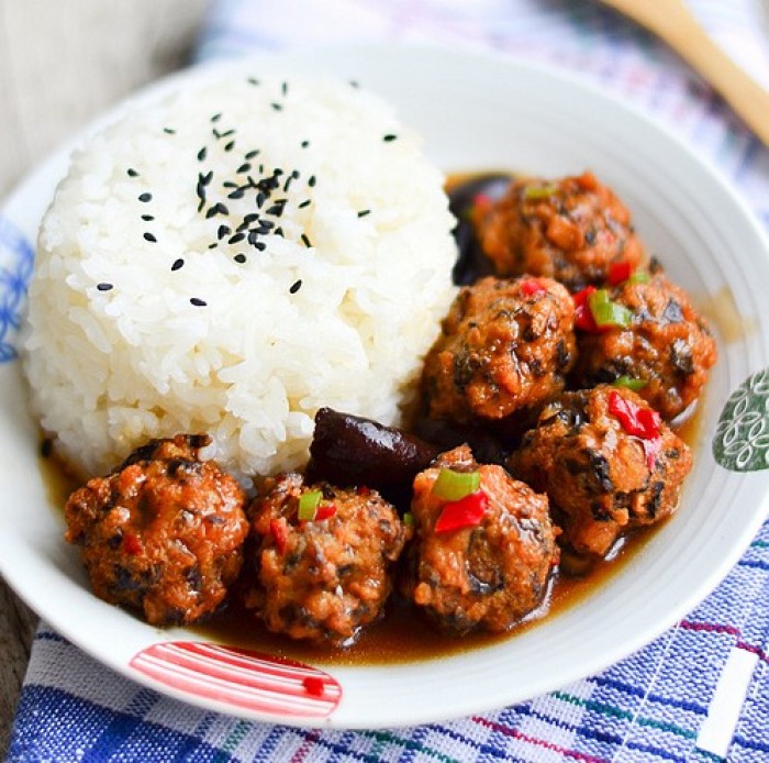 5、另起锅,倒适量的水,煮开倒1勺老抽,少许细砂糖倒入丸子,收汁的时候再倒入水淀粉即可。