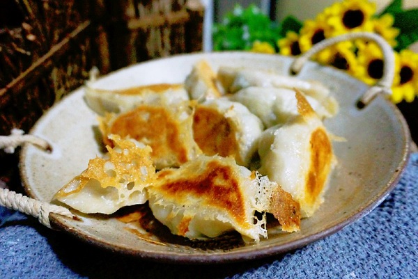 7、平底锅中放适量的油,五成热时摆放入柳叶饺。小火慢煎至底部变得金黄稍焦。