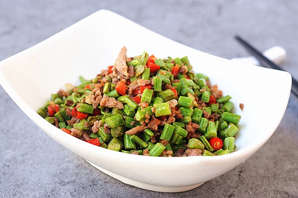 6、肉末一变色,立刻加入红辣椒碎,一起翻炒均匀。