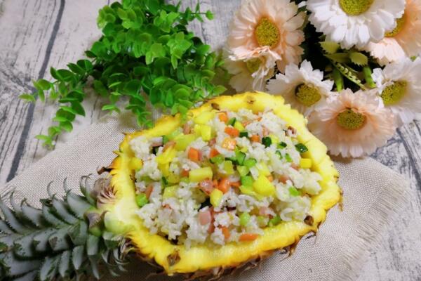 主料:菠萝半个、剩米饭1碗、胡萝卜1小段、黄瓜半根、火腿2片。