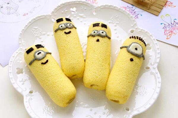 电影《神偷奶爸》中,短胳膊短腿、蠢萌蠢萌的小黄人深受大家喜爱,而它们最爱吃的是香蕉。这款“小黄人”蛋糕卷的做法很简单,内馅由香蕉、鸡蛋、牛奶组合,经过冷藏后,口感细腻冰凉,清爽不腻。卷好后,用融化的巧克力画上眼睛和嘴巴,小黄人就做好了,超可爱有没有?