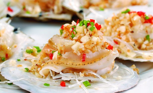 8、将蒜蓉铺在贝肉上面,并少淋点炸了蒜蓉的油在上面。