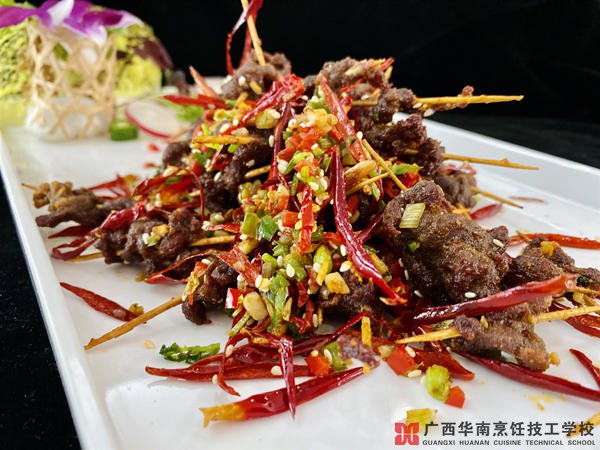 工艺流程:洗净一改刀一腌味—穿牛肉一炸一炒—装盘