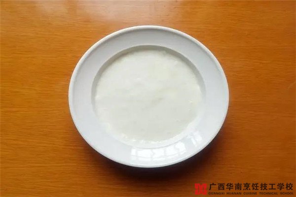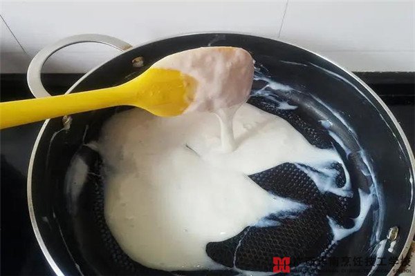 4、一直煮到液体变成浓稠的糊状,用刮刀提起糊糊能够拉出长长的条状,并且不易断,就代表熬煮好了。