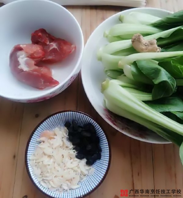猪肉(瘦) 50克、面条 150克、小白菜 200克、豆豉 10克、虾皮 10克、花生油 50克、精盐 2克、生抽 10克、蚝油 5克、料酒 5克、姜 1块