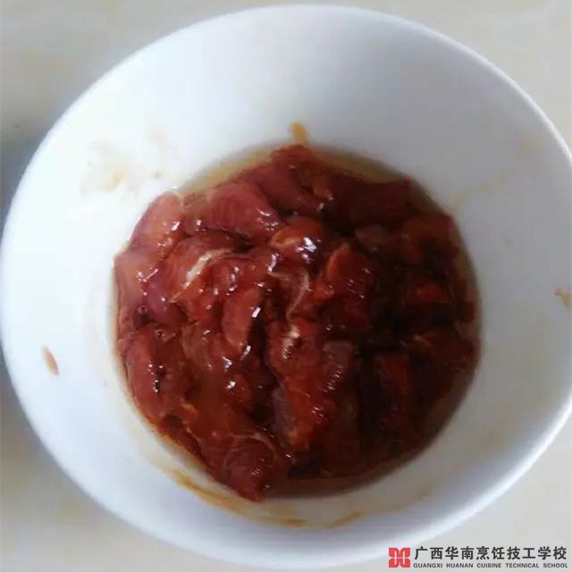 2.瘦肉洗净切薄片,放入盐、生抽、蚝油、料酒抓匀,再倒入少许花生油抓匀,腌制片刻