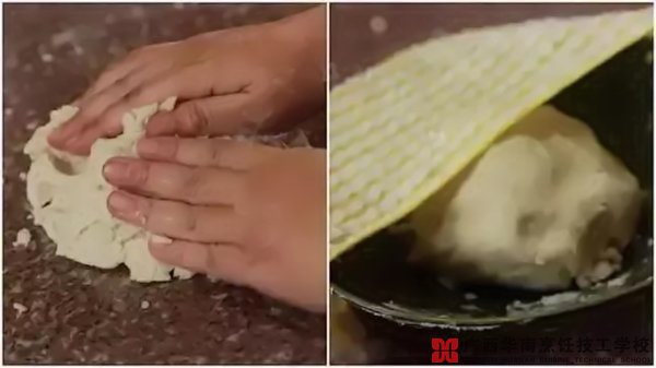 1.手指揉捏直到柔韧,约5至7分钟后成圆团形,用湿毛巾盖上备用。