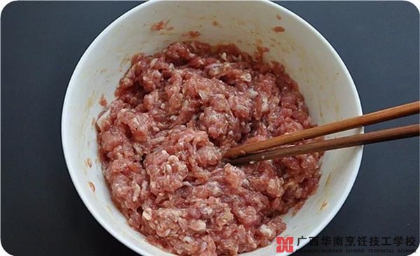 2、肉调好馅料后,放入干淀粉搅拌均。