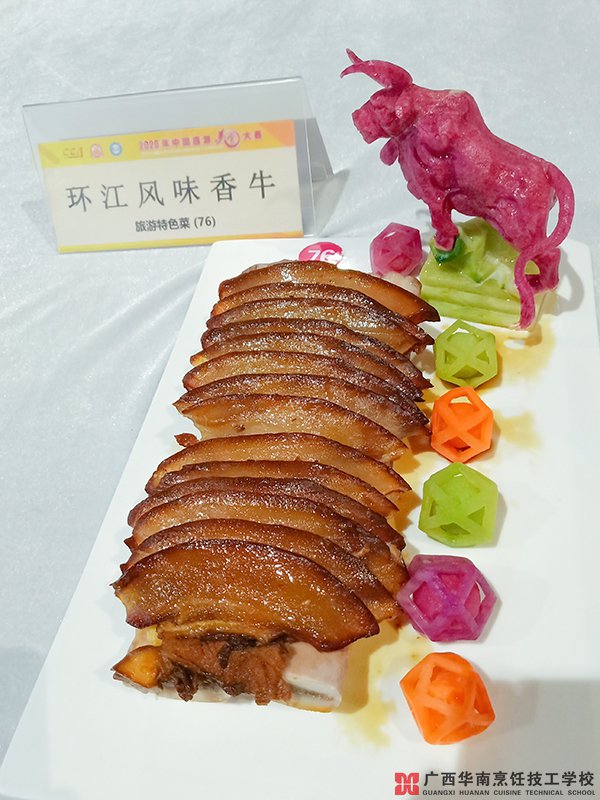 我校大师黄盛制作【环江风味香牛】一菜,从菜品风味、特色文化内涵等方面获得现场业内人士一种认可。据了解,环江香牛是广西环江毛南族自治县三宝(香猪、香牛、香鸭)之一,产于环江毛南族自治县内国家级喀斯特地貌原始森林自然保护区。独特的地理环境和绝无仅有的水土特性,令环江香牛膘肥体壮,肉质独特,呈粉红色,肥瘦相间,层次分明,鲜嫩纹细,有“三隔肉相间”之称。