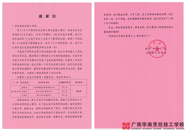 南宁市总工会为在比赛中能够取得好成绩,与我校建立了培训合作关系,我校也竭尽全力,大力支持和高度配合,不仅给参赛选手提供本校的场地与设备,还特邀了我校莫桂林老师对参赛选手们进行了为期一个月的系统化培训,最终南宁市代表队在西式面点师项目中斩获前三名。总工会为表感谢,特地向我校以及莫桂林老师送予感谢信,致以最真诚的感谢与问候。