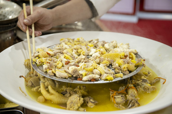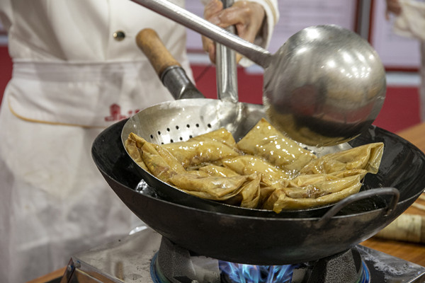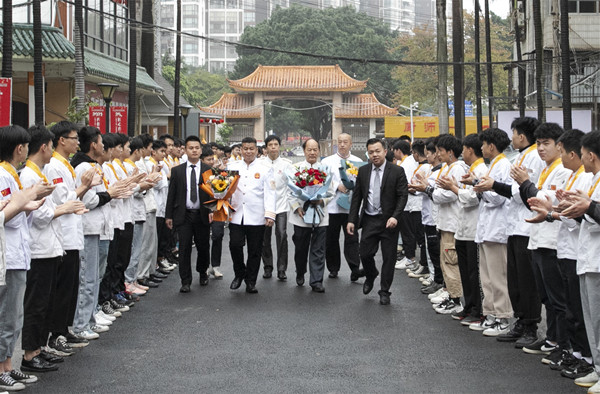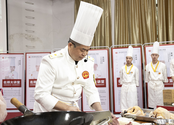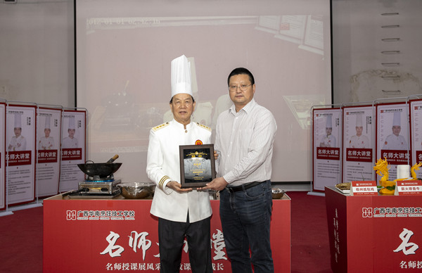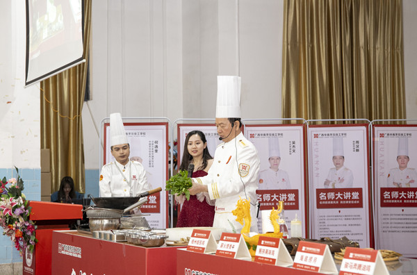 本次名师大讲堂的特邀大师——注册元老级中国烹饪大师、我校终身客座教授何逸奎大师;中国烹饪大师、广西烹饪协会理事、我校运营总经理黄盛大师;中国烹饪大师、我校热菜实操教师李西安大师;中式烹调技师、我校烧腊卤水实操教师吴杰文大师。四位大师为同学们现场讲解和演示梧州纸包鸡、薪火燎香牛、鲍拼两味鸡、海底捞月、油底走浆、骏马奔腾油鸡这几道集经典、创新于一体的菜品制作。