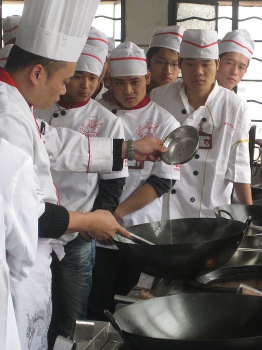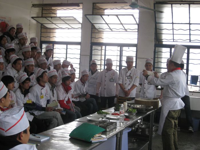 为丰富学生学习生活,开拓视野,丰富知识,加强校企合作与交流, 3月25日下午,烹饪事业部邀请广西南宁银河大酒店(三星级)厨师长陈建桥大师到我校为2011级新生上公开实训课。