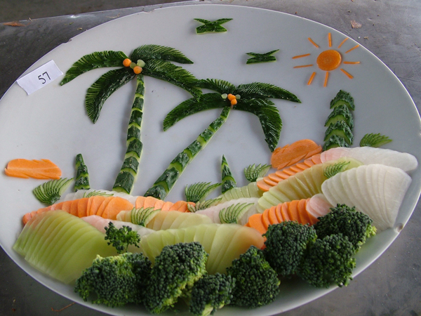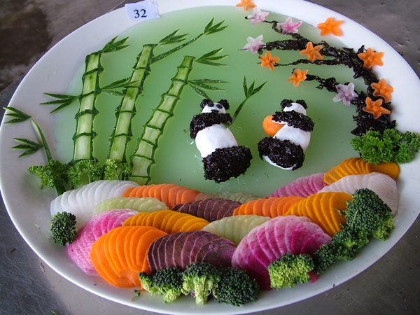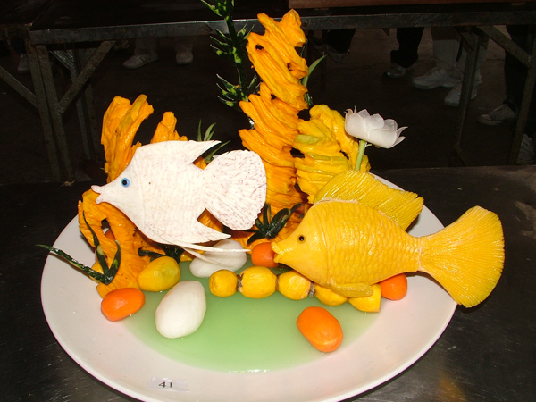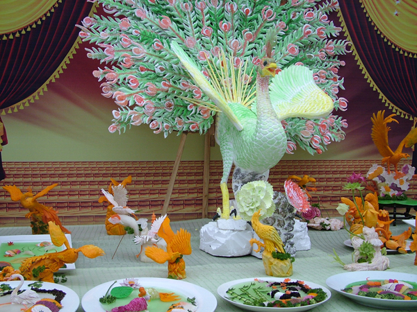 本次精美展台作品主要以食品雕刻为主,同学们选用坚实脆嫩、色泽纯正的根、茎、叶、瓜、果等蔬菜雕刻成各种动植物、人物、花卉、风光建筑等各种图案形态,是烹饪技术的一部分,同时又是烹饪殿堂里独特的艺术,它不仅美化了宴席,烘托了气氛,而且与菜肴完美搭配。使一精美的菜肴锦上添花,令人赏心悦目,耐人寻味。