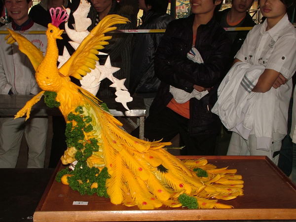 如此每一位毕业的华南学子不仅能拥有一手精湛的烹饪技能,而且雕刻技术同样了得。本次展台作品不仅为大家展现出了学子们阶段学习的成果,同时为大家带来一场视觉上的盛宴,而对于2012年秋季入学的新生学子来说,无疑是一次很好的学习机会,这不,下课时间,同学们纷纷聚焦展台,用手机留下这些精美的作品。还有不少同学则三三两两讨论着其中的奥妙,以借鉴学习。同时更是用自己独特的方式喜迎十八大的到来!