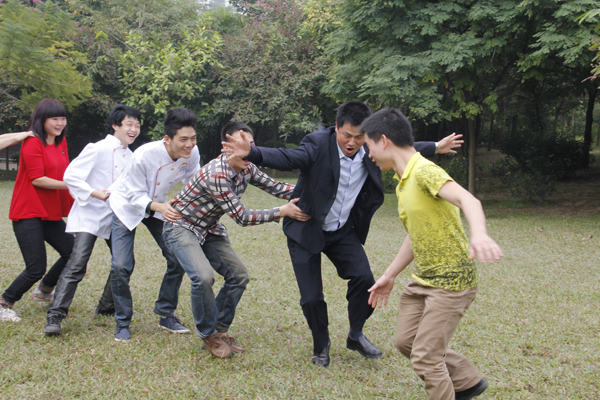 我校就业办主任朱伟(右二)和学生们一起玩老鹰捉小鸡游戏