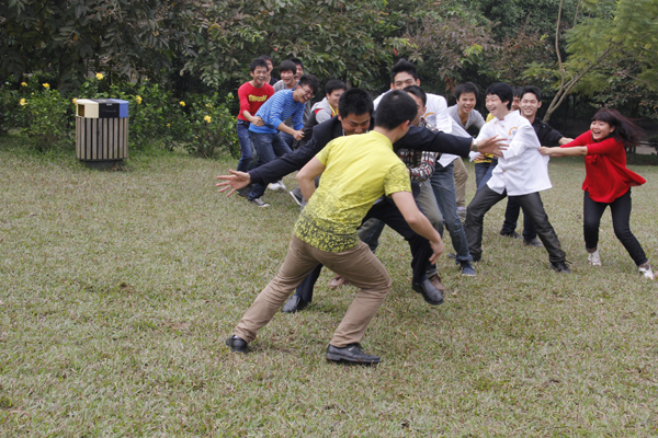 我校就业办主任朱伟(左二)和学生们一起玩游戏