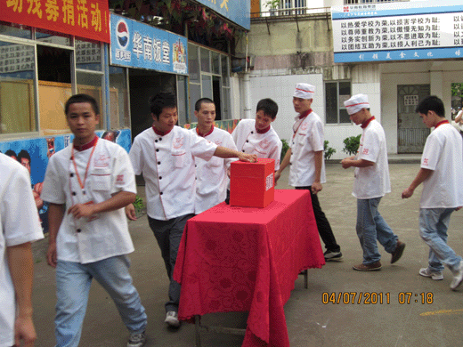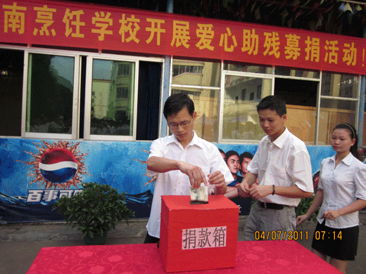 7月4日早上,我校响应南宁市西乡塘区政府的号召,在全国第二十一个“助残日”到来之际在烹饪校区食堂前操场举行了“助残捐款”仪式。全校师生参加了此次活动,在仪式上首先由校长向学生进行了助残教育,然后学生代表作了表态发言。其后在全校领导的带领下进行了捐款活动。本次活动的所有捐款将交付南宁市西乡塘区政府从事特教事业。