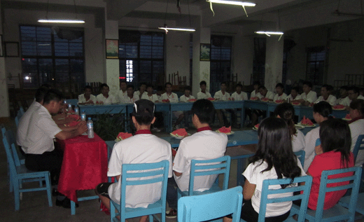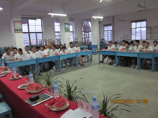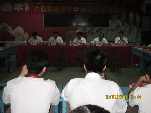 2011年7月18日晚上7点半,广西华南烹饪学校组织召开2011级第二期新生见面会,教务科魏老师、学生科司老师、后勤保障部万老师、就业办公室郭老师和班主任黎老师等参加了见面会。