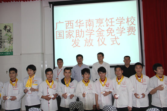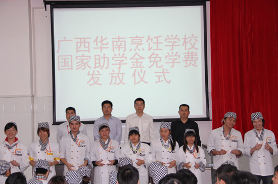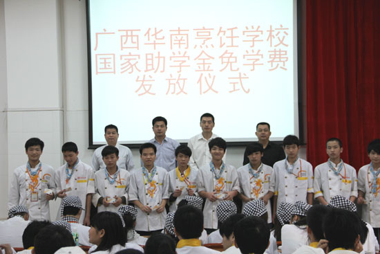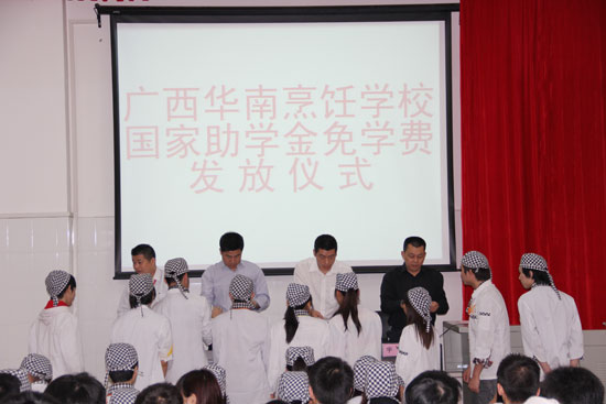 2013年3月28日上午,广西华南烹饪学校隆重举行2012-2013学年度国家助学金免学费颁发仪式。